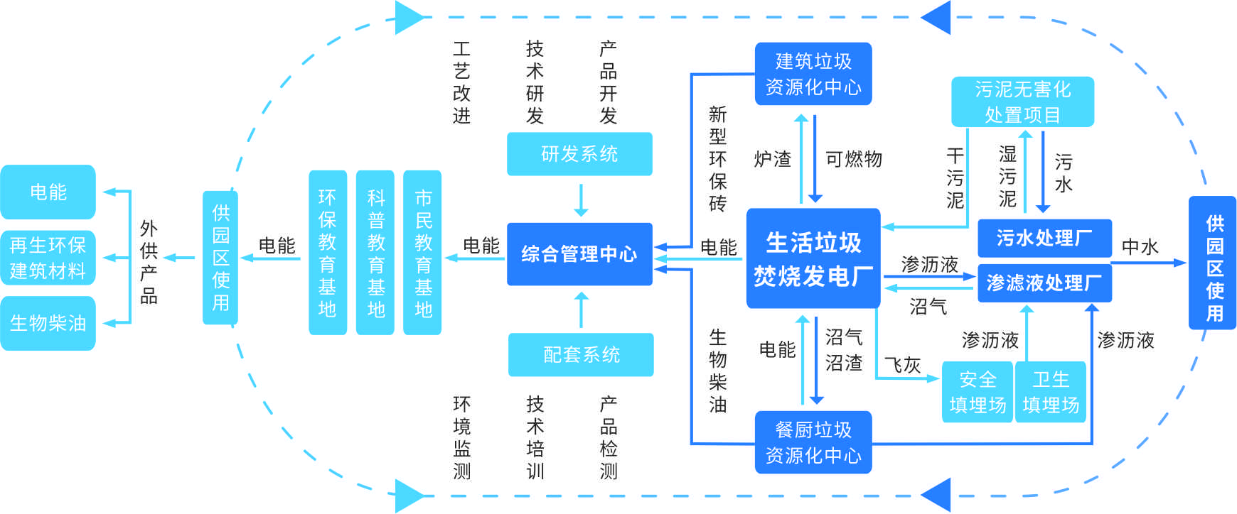 jiuyou.com九游环境循环经济产业园模式以生活垃圾焚烧发电厂为园区核心,统筹各类生活垃圾处置中心的配套建设,对各类生活废弃物进行无害化、减量化、资源化处理,输出电能、建筑材料、生物柴油等副产物,为园区生产、生活提供服务。