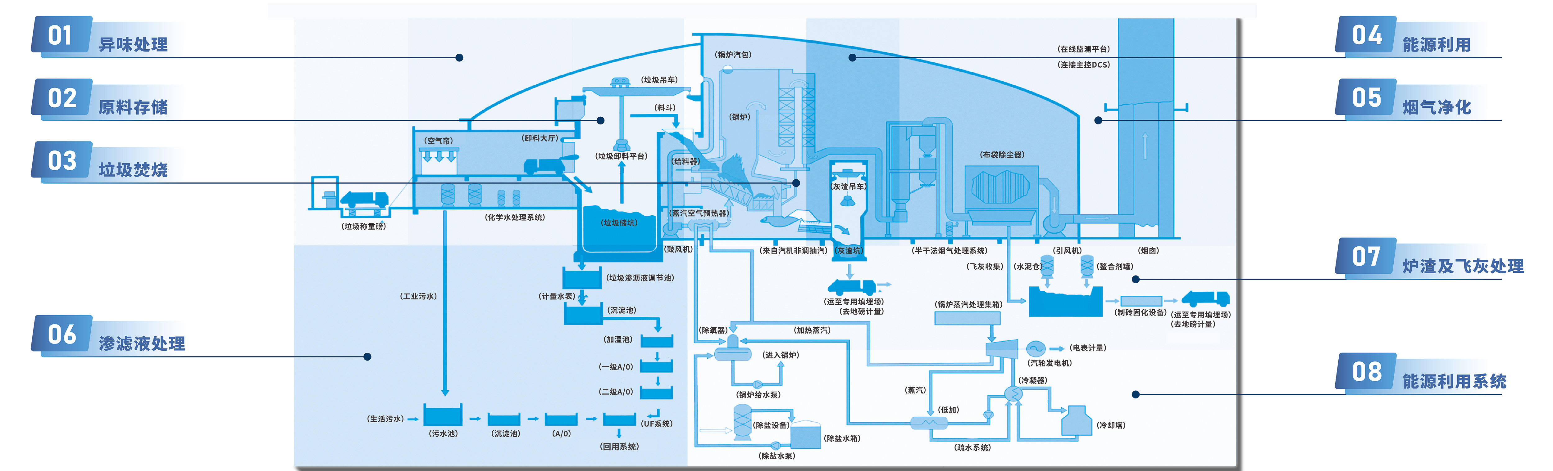 jiuyou.com九游环境生活垃圾焚烧发电处理模式将全流程划分为八大模块,构建囊括垃圾入库、储存、焚烧,烟气净化、渗滤液处理、炉渣及飞灰处理、热能产生、能源利用的八大系统。